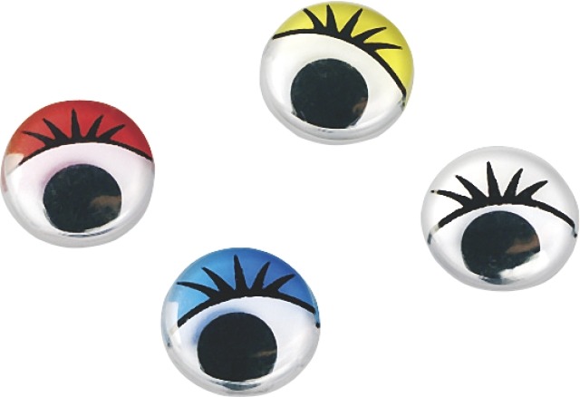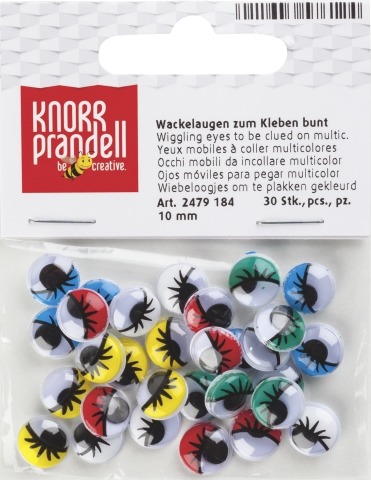 Plastikowe oczka z ruchomą czarną źrenicą i kolorową powieką. Opakowanie zawiera 30 sztuk oczek o średnicy 10 mm. Oczka można przykleić klejem bądź taśmą dwustronnie klejącą. Zastosowanie we wszystkich pracach plastycznych.