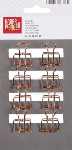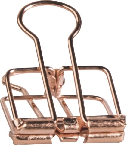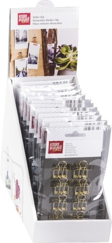 Displey zawiera 12 opakowań metalowych klipsów dekoracyjnych wielkości 19 mm. Po 4 opakowania: złotych, srebrnych oraz w kolorze różowego złota. Nadają się do zamykania i dekorowania.