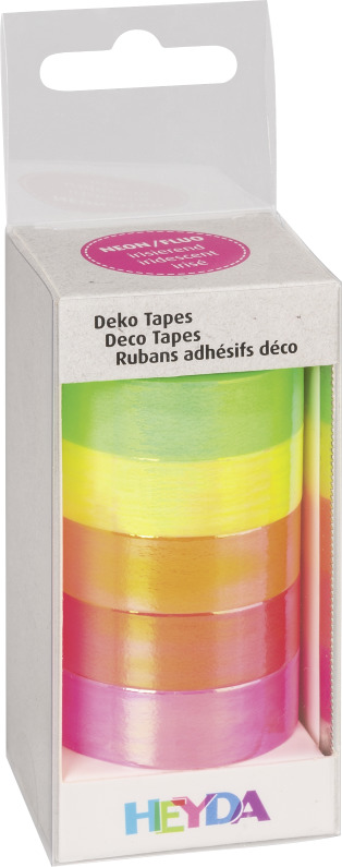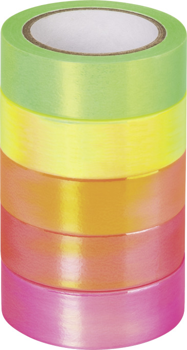 Opakowanie zawiera 5 rolek po pięć metrów tasiemek neonowych, matowych. Opakowanie posiada ostrze do odcinania tasiemek.