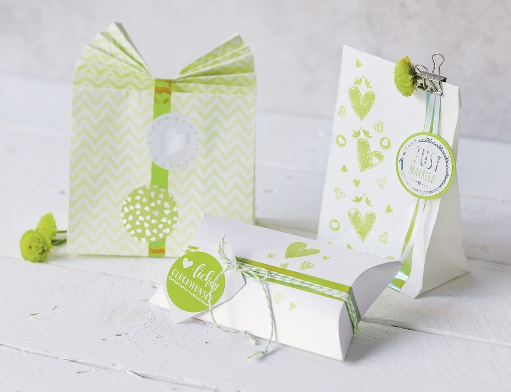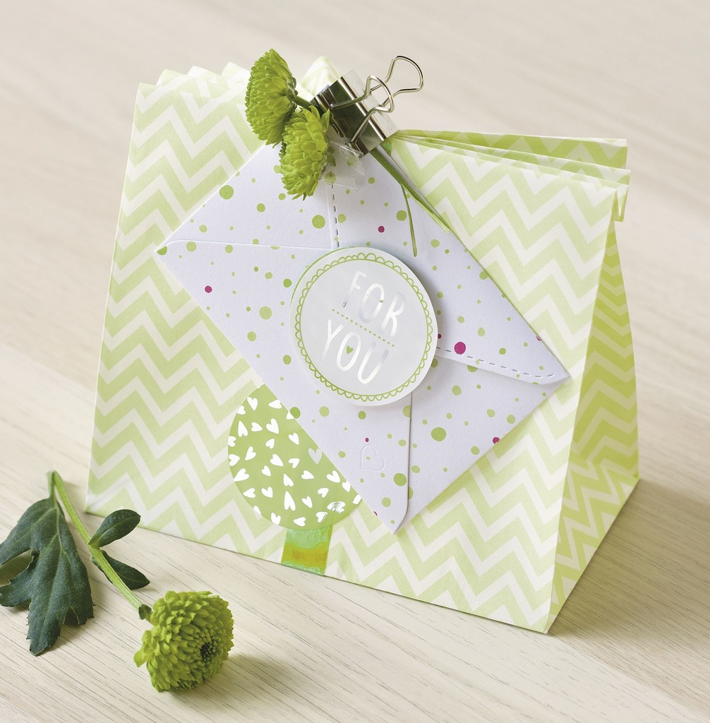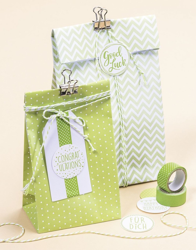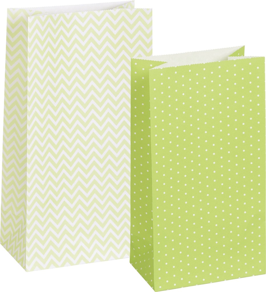 Opakowanie zawiera 12 sztuk papierowych torebek w dwóch wzorach i dwóch rozmiarach: jasnozielone 130 x 75 x 240 mm i zielone 97 x 60 x 180 mm.