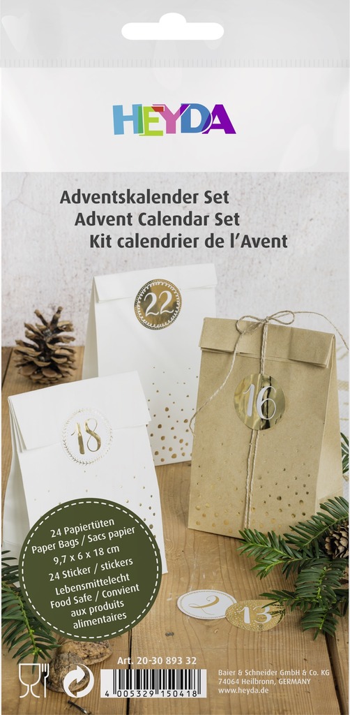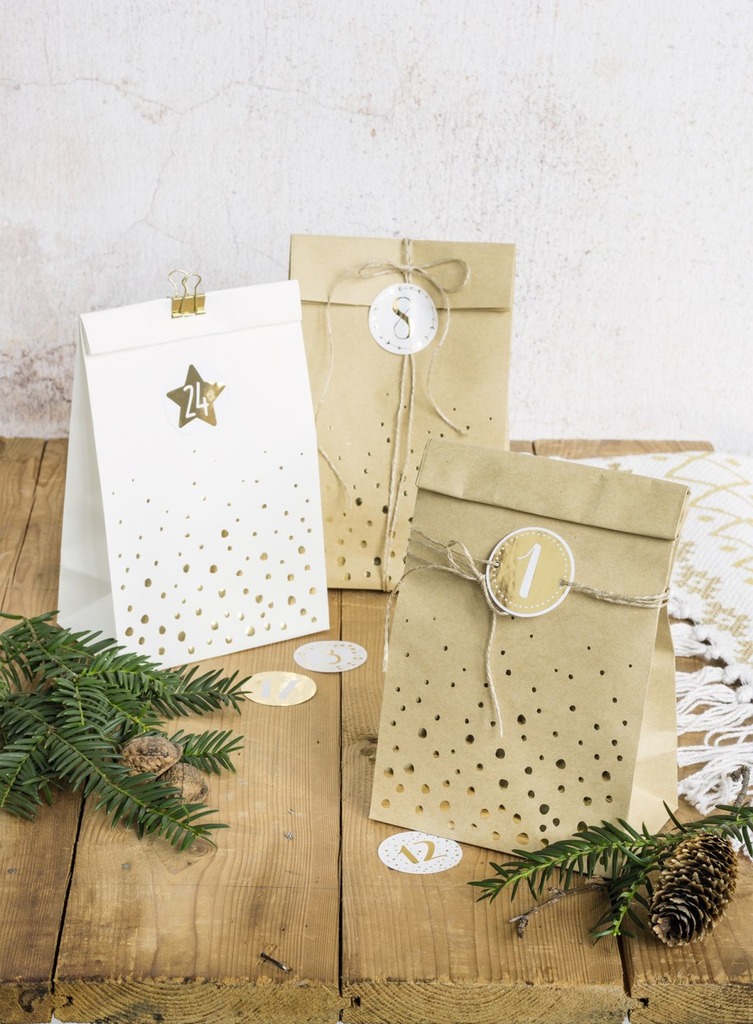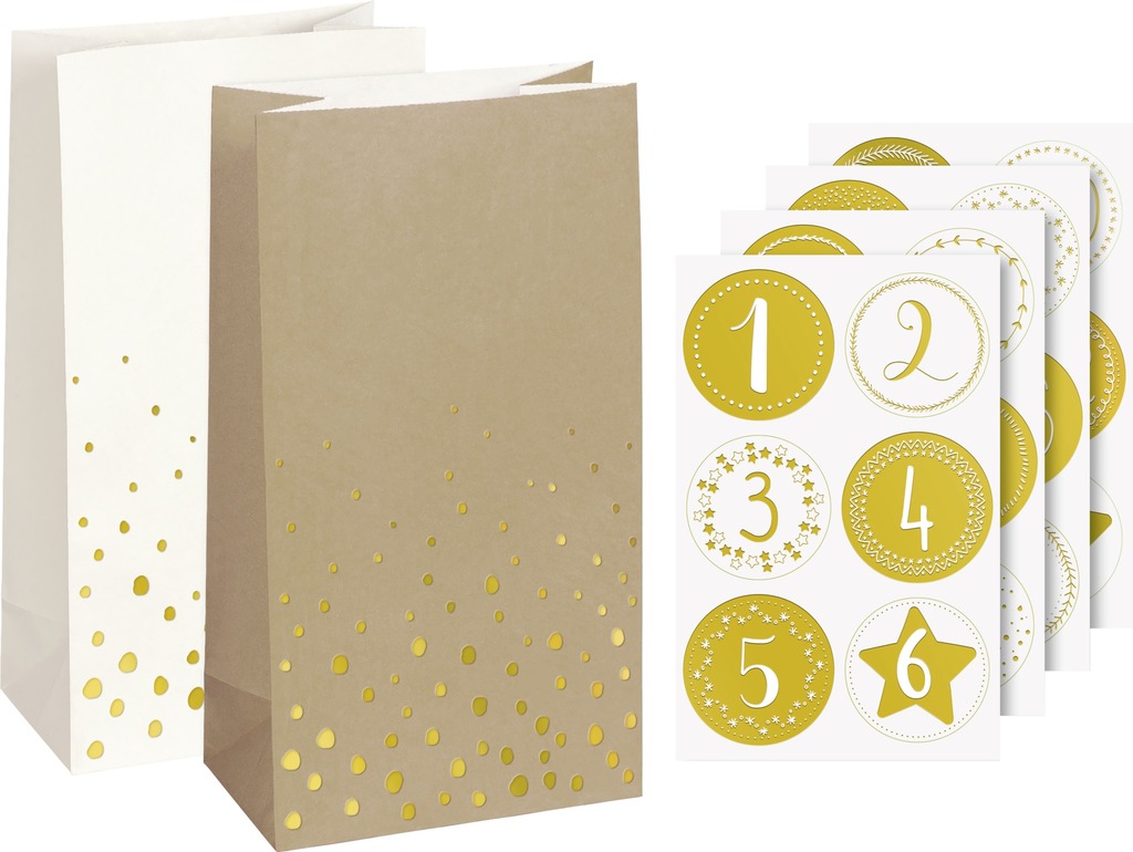 Opakowanie zawiera 24 sztuki papierowych torebek o wymiarach 18 x 9,7 x 6 cm oraz 24 naklejki numerowane. Torebki białe w złote giwazdki i naturalne w złote gwiazdki.