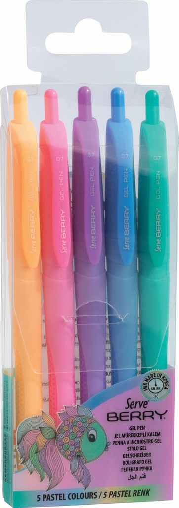 Zestaw długopisów żelowych, z ergonomicznym uchwytem. 5 pastelowych kolorów: pomarańczowy, różowy, fioletowy, niebieskie i miętowy. Grubość linii 0,7 mm.