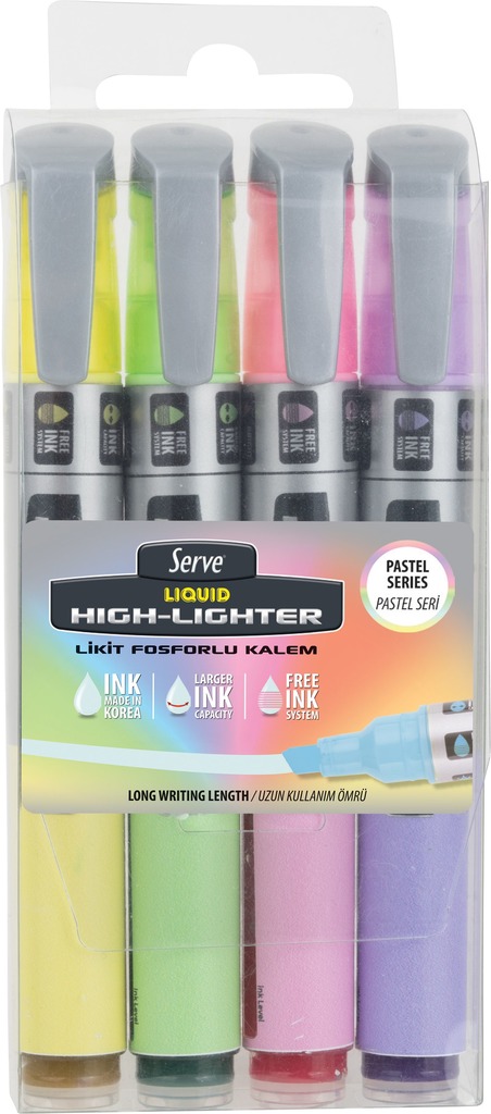 Zakreślacze z przezroczystym pojemnikiem na tusz, dzięki czemu widoczny jest poziom zużycia. 4 pastelowe kolory: żółty, zielony, różowy i fioletowy. Grubość linii 1 -5,5 mm.