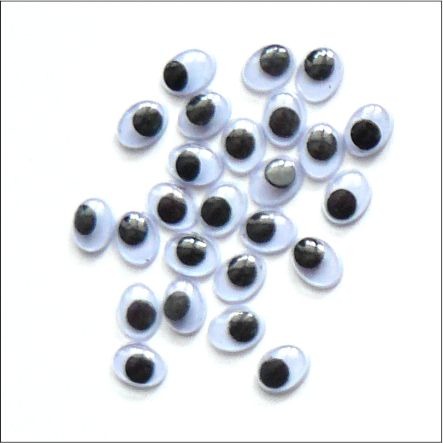 Plastikowe oczka z ruchomą czarną źrenicą. Opakowanie zawiera 1000 sztuk oczek o średnicy 8 mm. Oczka można przykleić klejem bądź taśmą dwustronnie klejącą. Zastosowanie we wszystkich pracach plastycznych.