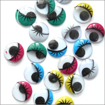 Plastikowe oczka z ruchomą czarną źrenicą i kolorową powieką. Opakowanie zawiera 100 sztuk oczek o średnicy 15 mm. Oczka można przykleić klejem bądź taśmą dwustronnie klejącą. Zastosowanie we wszystkich pracach plastycznych.