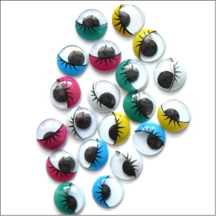 Plastikowe oczka z ruchomą czarną źrenicą i kolorową powieką. Opakowanie zawiera 100 sztuk oczek o średnicy 10 mm. Oczka można przykleić klejem bądź taśmą dwustronnie klejącą. Zastosowanie we wszystkich pracach plastycznych.