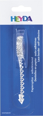 Biała koronka samoprzylepna, 2 metry, szerokość 8 mm. Na koronkę można nanosić stemple. Opakowanie można używać jako dozownik. Koronka stanowi piękne wykończenie pracy.