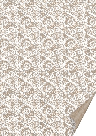 Karton z białym wzorem, koronka. Papier pochodzący z recyklingu, drukowany z jednej strony. Gramatura 220 gram.