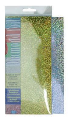 Opakowanie sześciu arkuszy foli samoprzylepnej (3 arkusze diamentowe, złote i 3 arkusze diamentowe, srebrne). Format 10 x 23 cm.