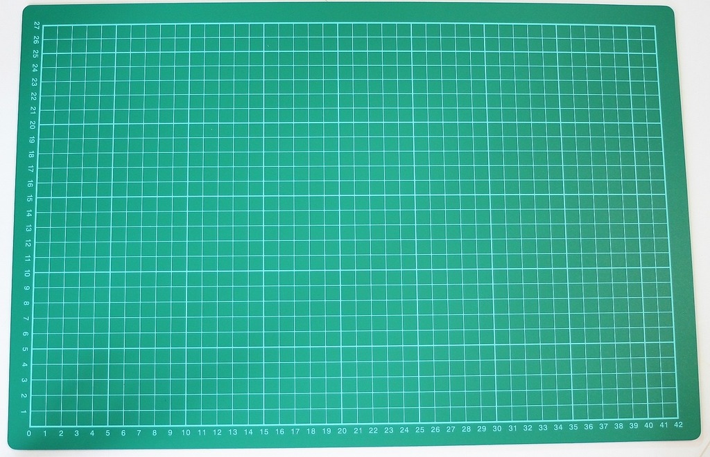 Rozmiar 450 x 300 x 3 mm. Powierzchnia maty jest odporna na przecięcia. Składa się z trzech warstw. Posiada podziałkę centymetrową.